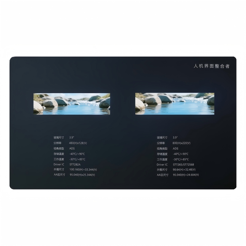This highly integrated display solution features a compact 3.9-inch TFT screen with an active area (AA) of 95.040(H) x 25.344(V) within a minimal outer frame measuring 100.160(H) x 33.344(V). Delivering sharp clarity with a 480x128 resolution, it utilizes ADS technology for wide viewing angles. Engineered for reliability, it operates from -30℃ to 85℃ and withstands storage from -40℃ to 90℃, supported by the ST7282A driver IC for robust performance.