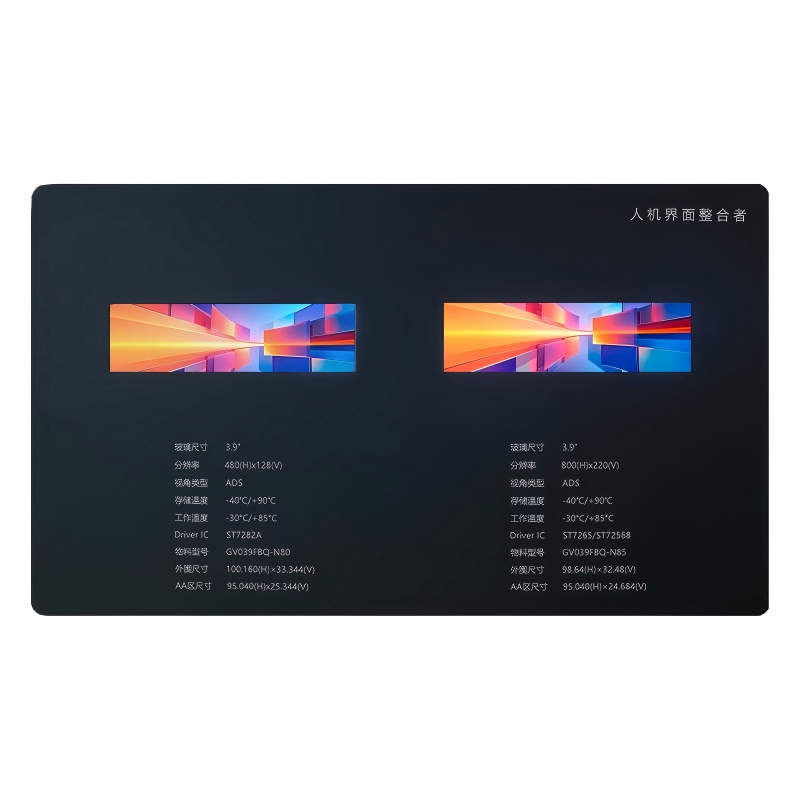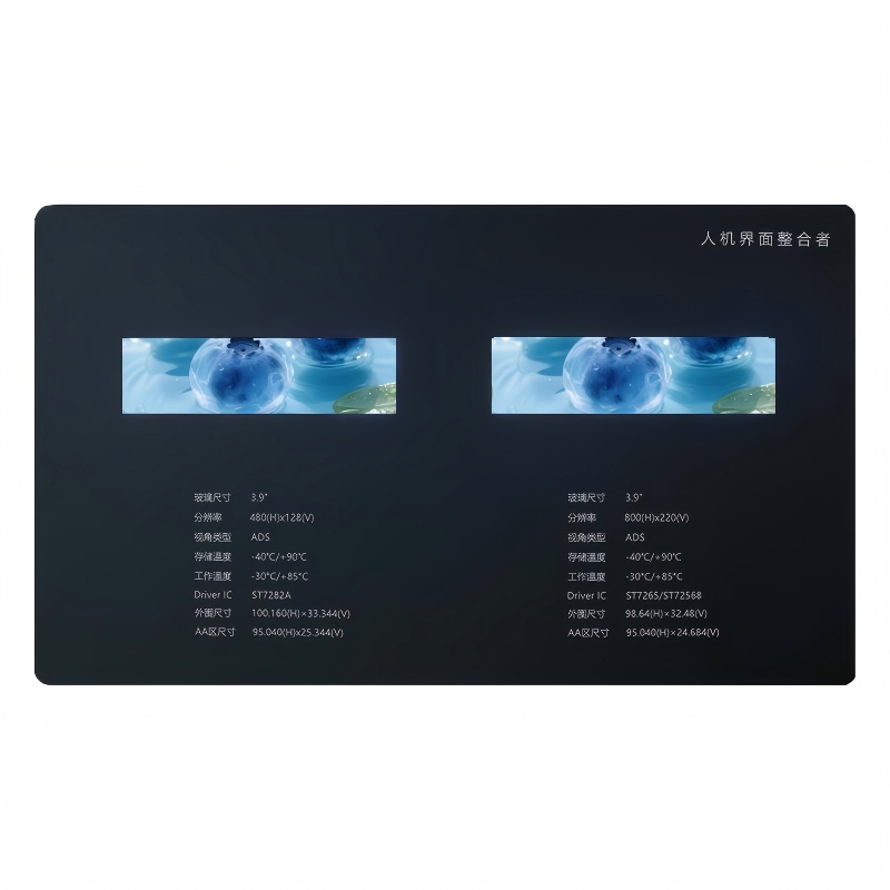 This highly integrated display solution features a compact 3.9-inch TFT screen with an active area (AA) of 95.040(H) x 24.684(V) within a minimal outer frame measuring 98.64(H) x 32.48(V). Delivering sharp clarity with an 800x220 resolution, it utilizes ADS technology for wide viewing angles. Engineered for reliability, it operates from -30℃ to 85℃ and withstands storage from -40℃ to 90℃, supported by the ST7265/ST72568 driver IC for robust performance.
